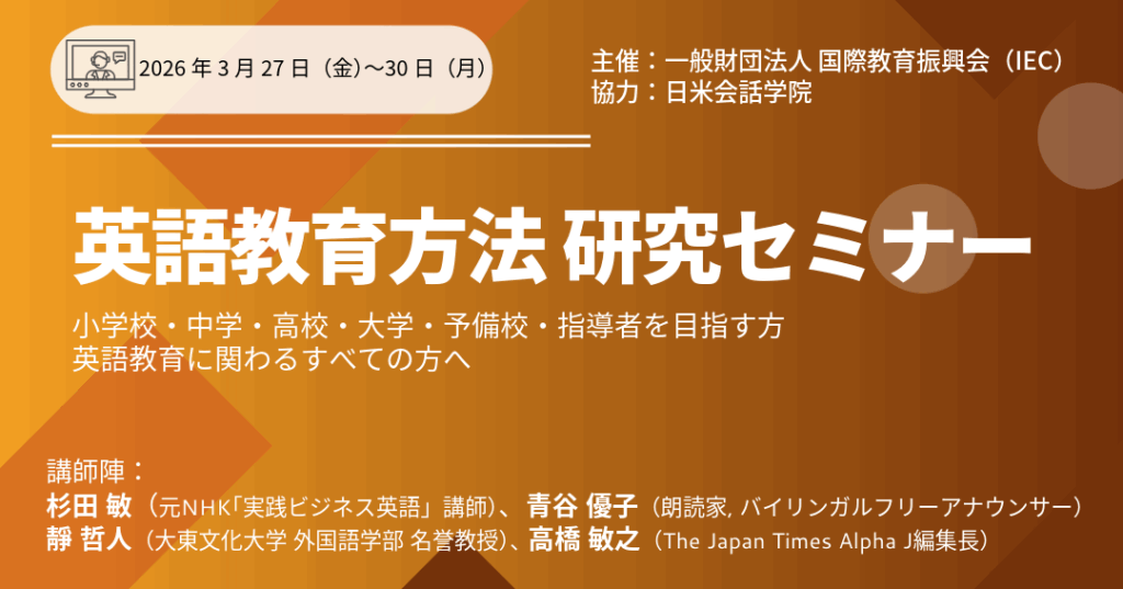 対象:小学校教員、中学・高校の英語教員、英語教員志望の大学生、英語教育に関心のある一般社会人など
